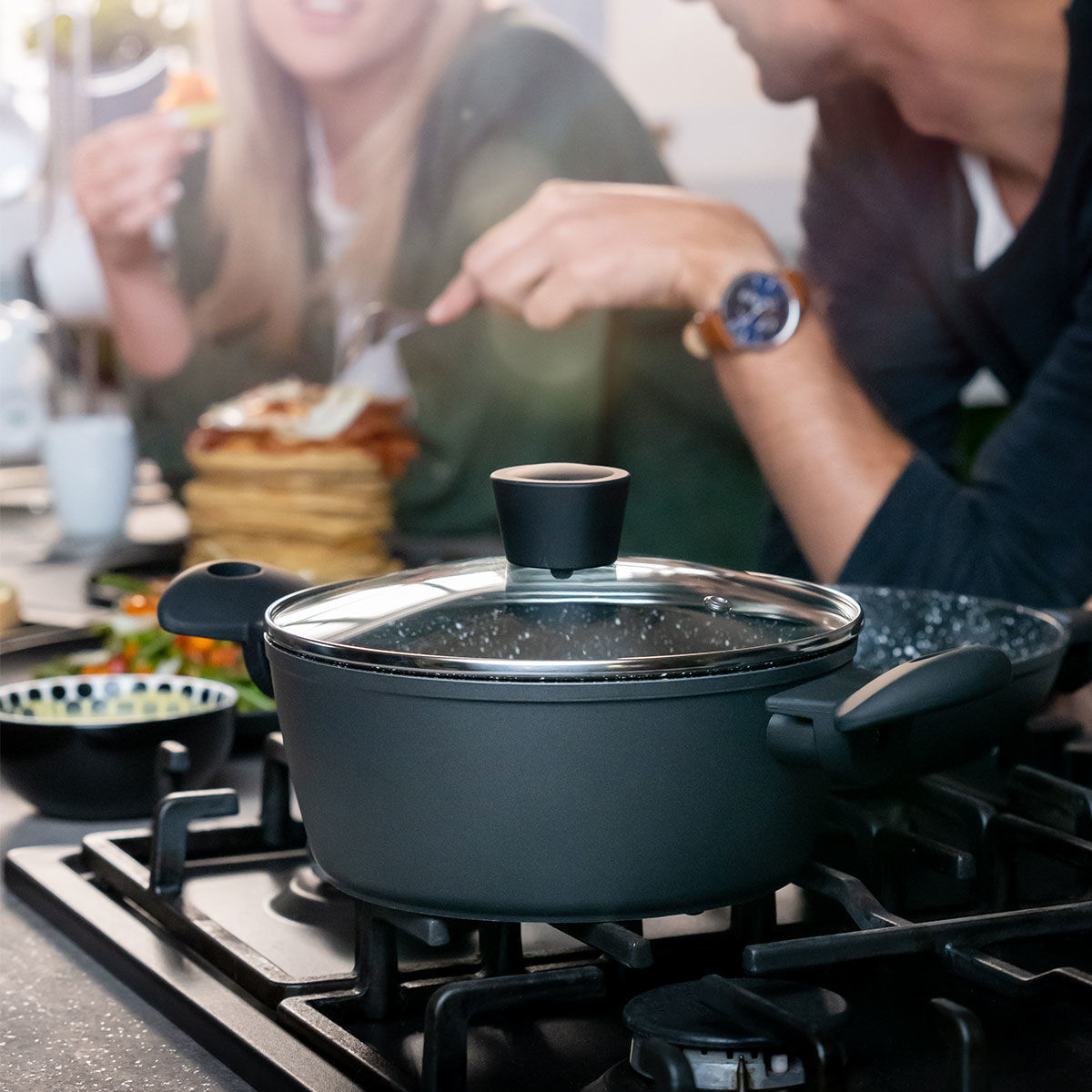 Ανακαλύψτε τις κατσαρόλες Magma Series ιδανικές για κάθε κουζίνα και νοικοκυριό. Κατασκευασμένες από πρεσσαριστό αλουμίνιο πάχους 3.0 mm για άψογη απόδοση σε κάθε χρήση. Προσφέρουν ομοιόμορφη κατανομή της θερμοκρασίας για τέλειο ψήσιμο και γρήγορο μαγείρεμα. Η τριπλή μαρμάρινη αντικολλητική επίστρωση που διαθέτουν προσφέρει εντυπωσιακές αντικολλητικές ιδιότητες και ενισχυμένη ανθεκτικότητα στα γδαρσίματα. Με γυάλινο πυράντοχο καπάκι που περιβάλλεται από ανοξείδωτο στεφάνι και εργονομικές αντιολισθητικές λαβές από βακελίτη που παραμένουν κρύες κατά το μαγείρεμα για άνετο κράτημα.
